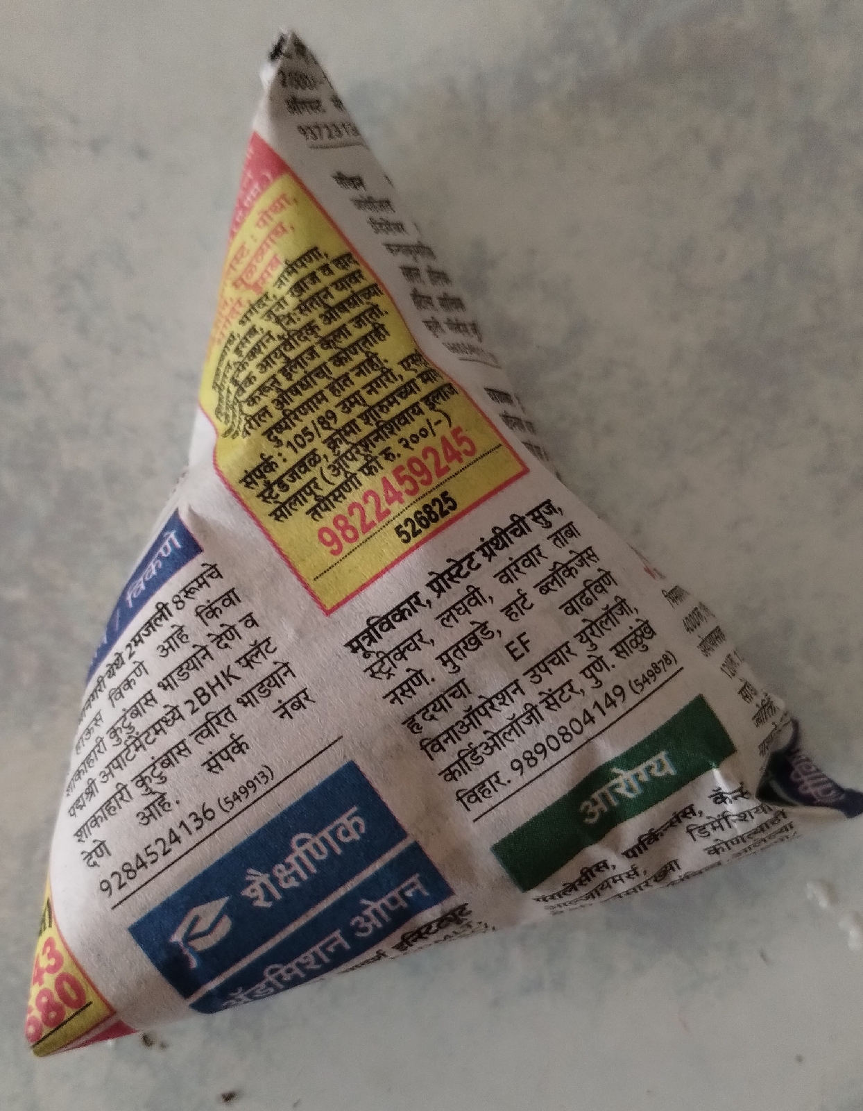 अलिकडे कित्येक वर्षांमधे मला अशा कागदाच्या पुड्या बघायची सवयच राहिलेली नाही. दुकानदाराने अगदी सफाईने भराभर पुड्या बांधल्या होत्या. घरी येईपर्यंत एकही पुडी सुटली नव्हती, हे विशेष. प्रत्येक पुडीच्या आत वर्तमानपत्राचा एक छोटा तुकडा बाहेरच्या मोठ्या तुकड्याला आधार देत होता!